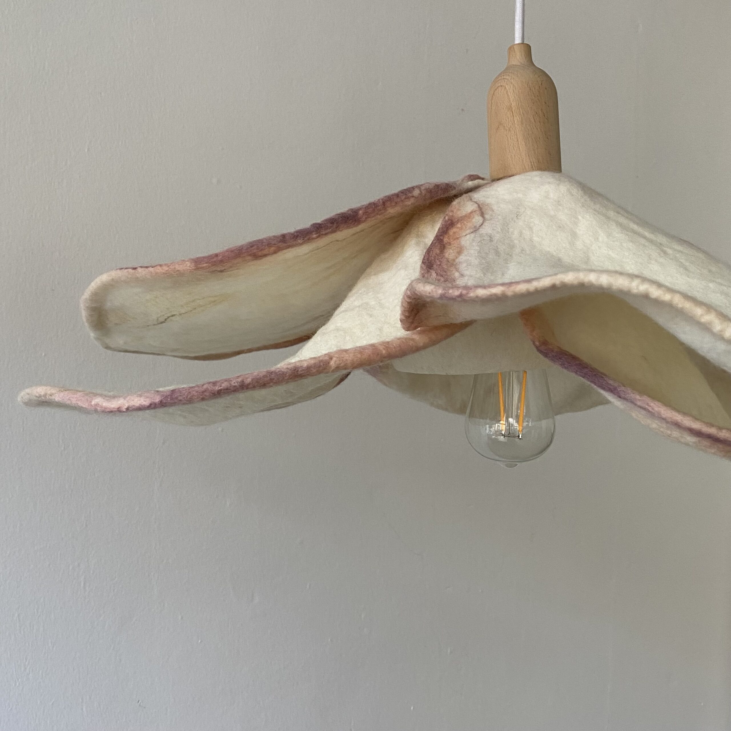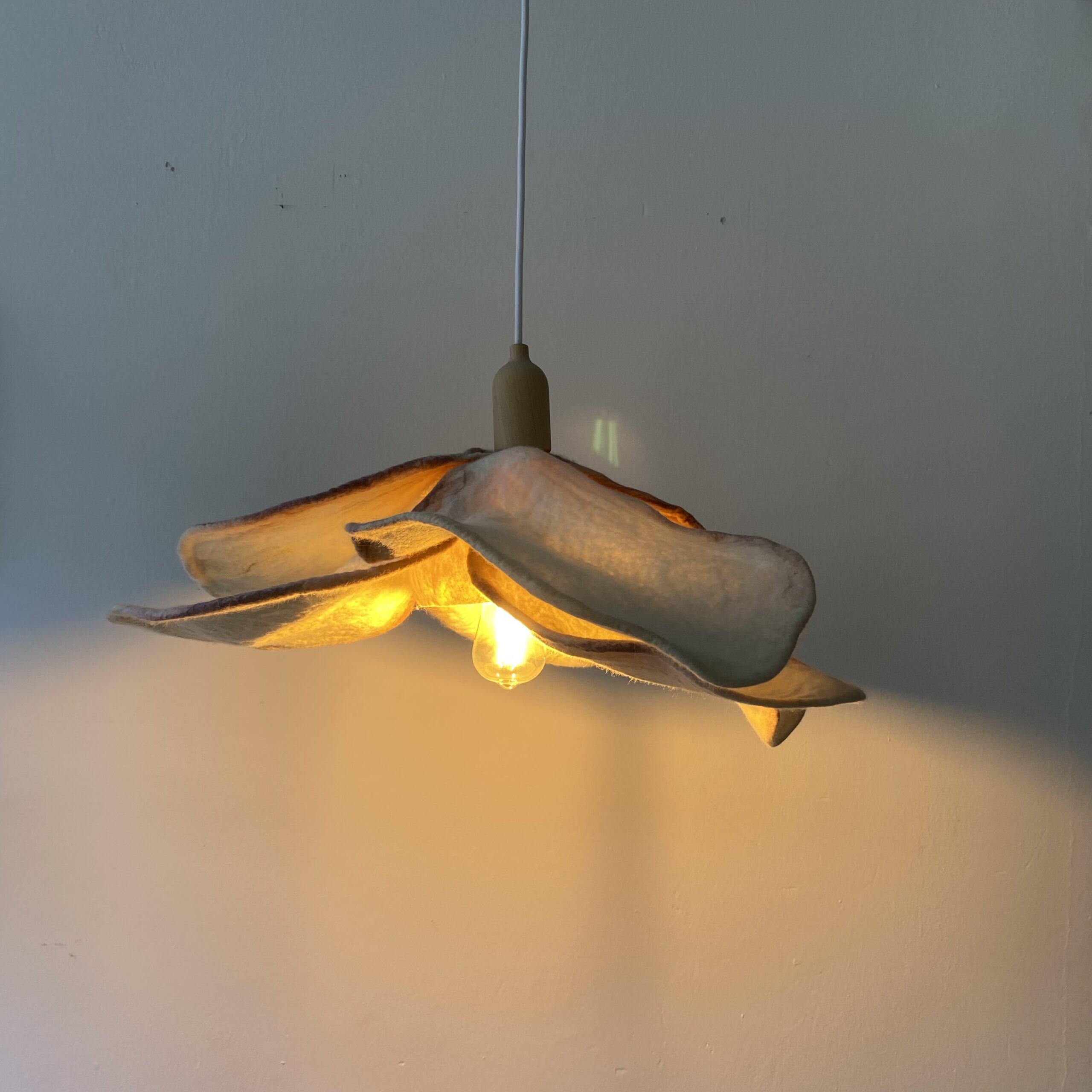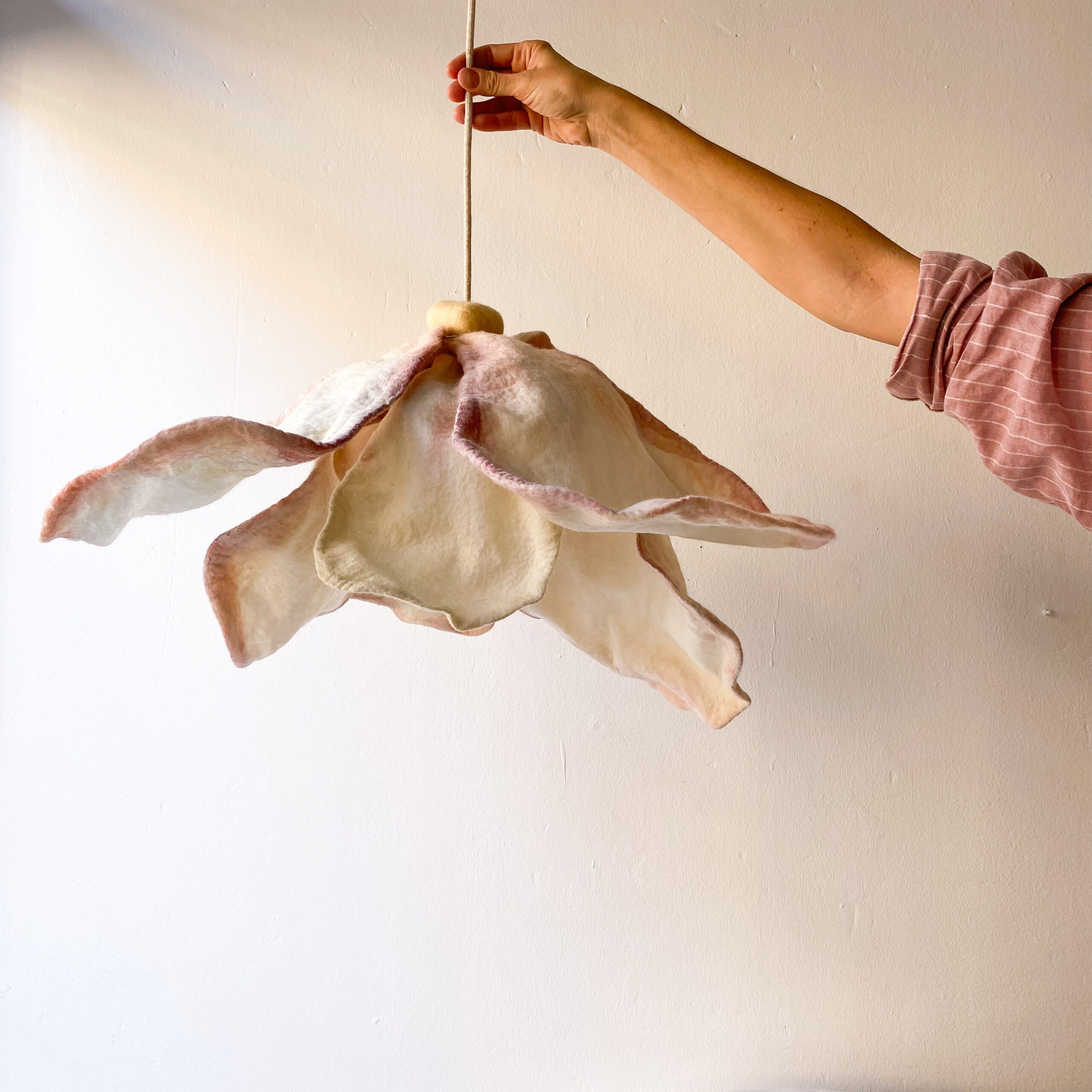 Lámpara hecha con lana, cuyos pétalos son desmontables para facilitar su transporte.